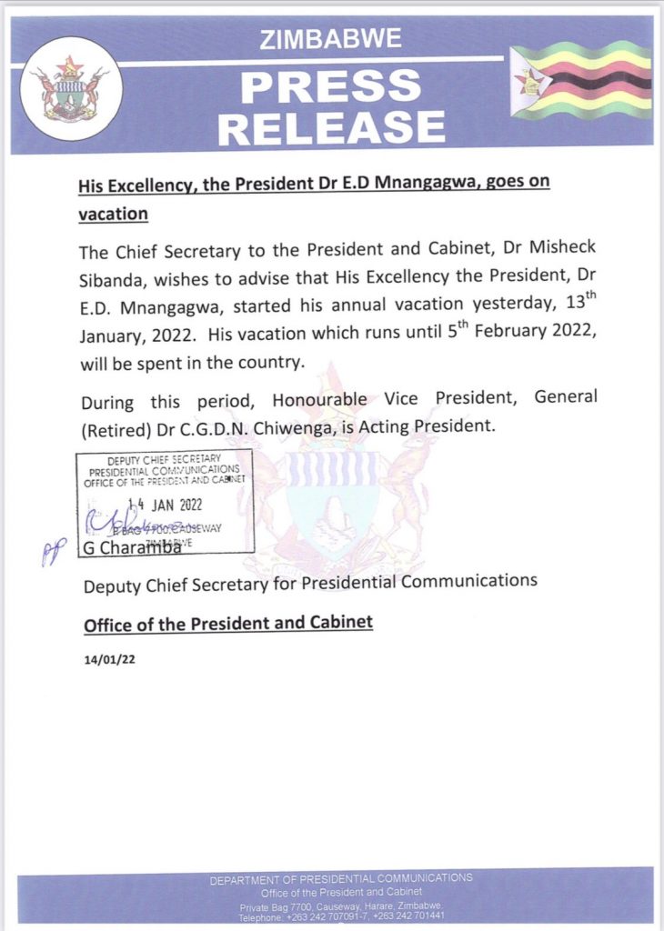 “The Chief Secretary to the President and Cabinet, Dr. Mugisheck Sibanda wishes to advice that His Excellency the Preside, Dr ED Mnangagwa, started his annual vacation yesterday 13th January 2022. His vocation, which runs until 5th February 2022, will be spent in the country. During this period, Honourable Vice President General (Retired) Dr. CGDN Chiwenga is acting President,” said a statement issued by the President’s Office.