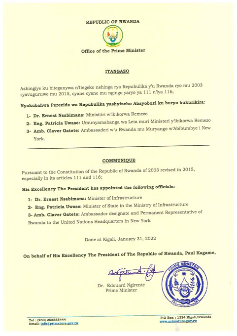 The Changes in Cabinet saw Amb. Claver Gatete dropped from Cabinet to a new job of Ambassador-Designate and Permanent Representative of Rwanda to the United Nations Headquarters in New York.